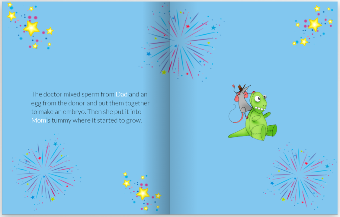 You personalize your book – moving around clipart if you wish, adding photos and editing any of the text so that it is not just a story about IVF or surrogacy, it is your own story.