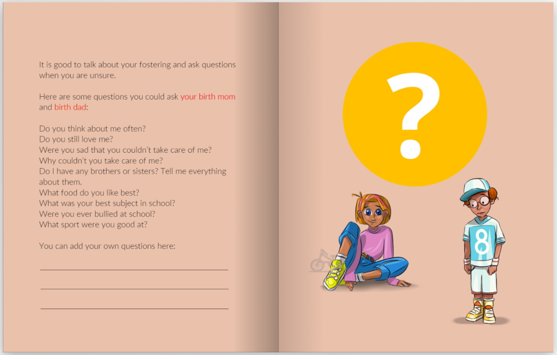 This book aims to encourage openness. Advice is, don’t wait for your child to ask questions. It’s very common for children not to ask questions, particularly about their birth parents. This can be because they don’t know to ask, or what to ask about, or because they don’t want to hurt their foster/adopting parents’ feelings. Each time you read this book with your child encourage them to ask you questions.