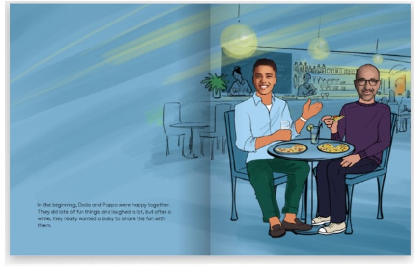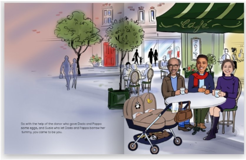 You upload photos of the characters in your story and we create avatar heads for them, then place those onto the illustrations (which we also colour the correct skin tone). Then you change the words to make it your own. The end result is not just a story about IVF or surrogacy, it is your own story.